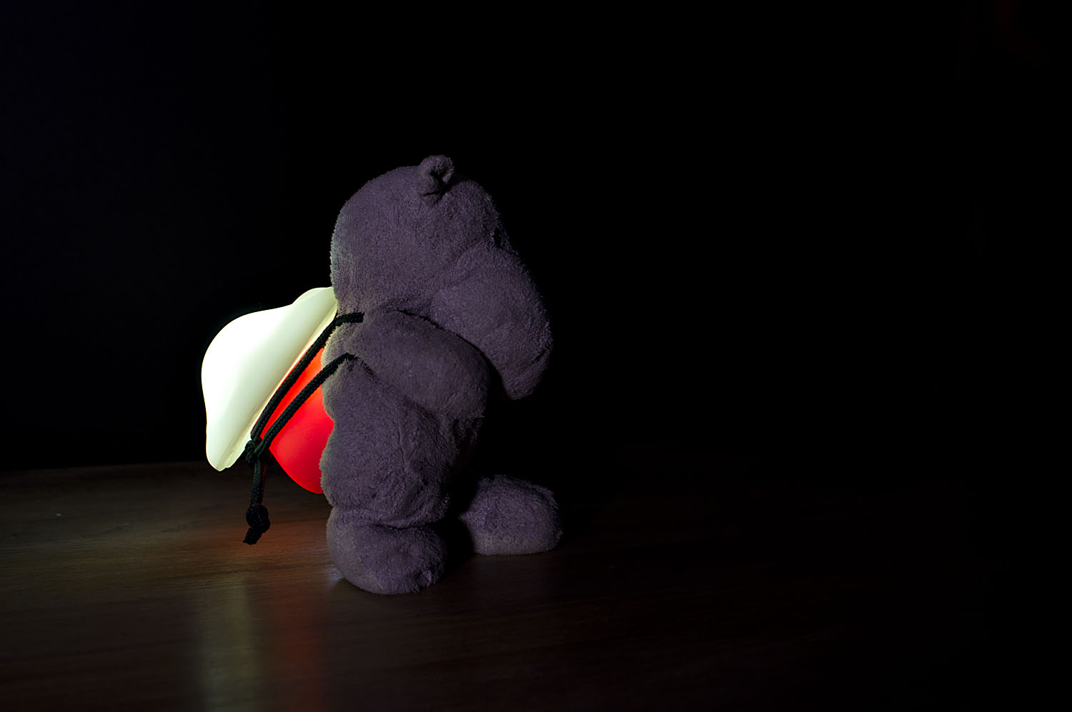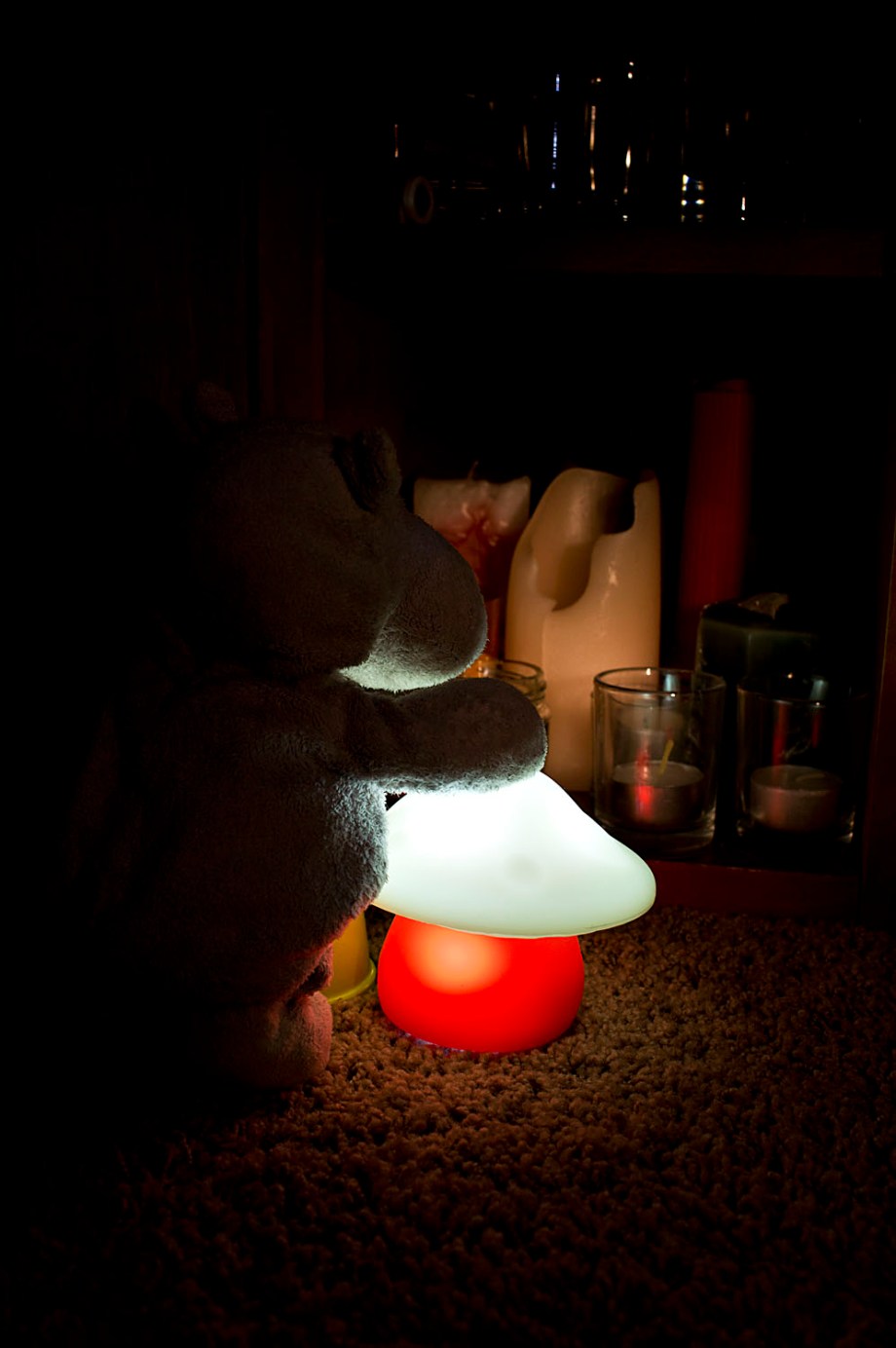 Using some yarn, tie your illuminated mushroom to your back. This will help you find your way in the dark.