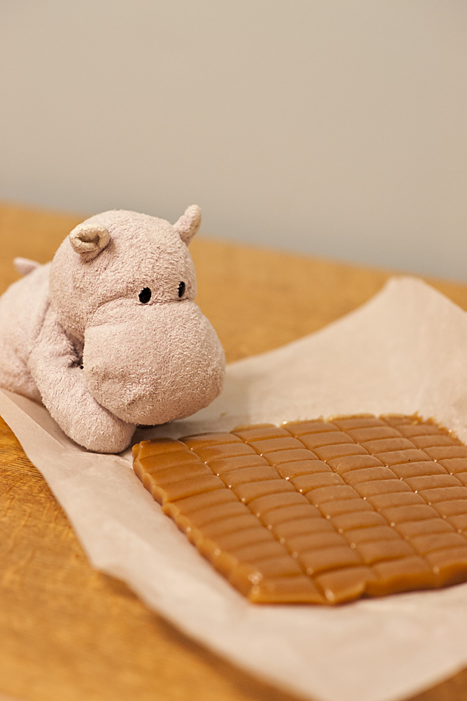 Instead of scarfing down the whole block of caramel, divide it into even rectangles or squares using a sharp knife or a pizza cutter