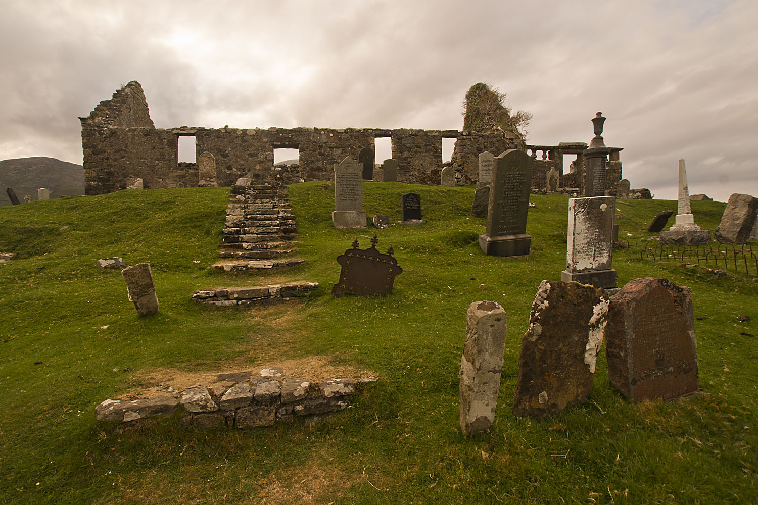 The burial enclosure of the parish looking toward Beinn na Caillich (Red Hills)
